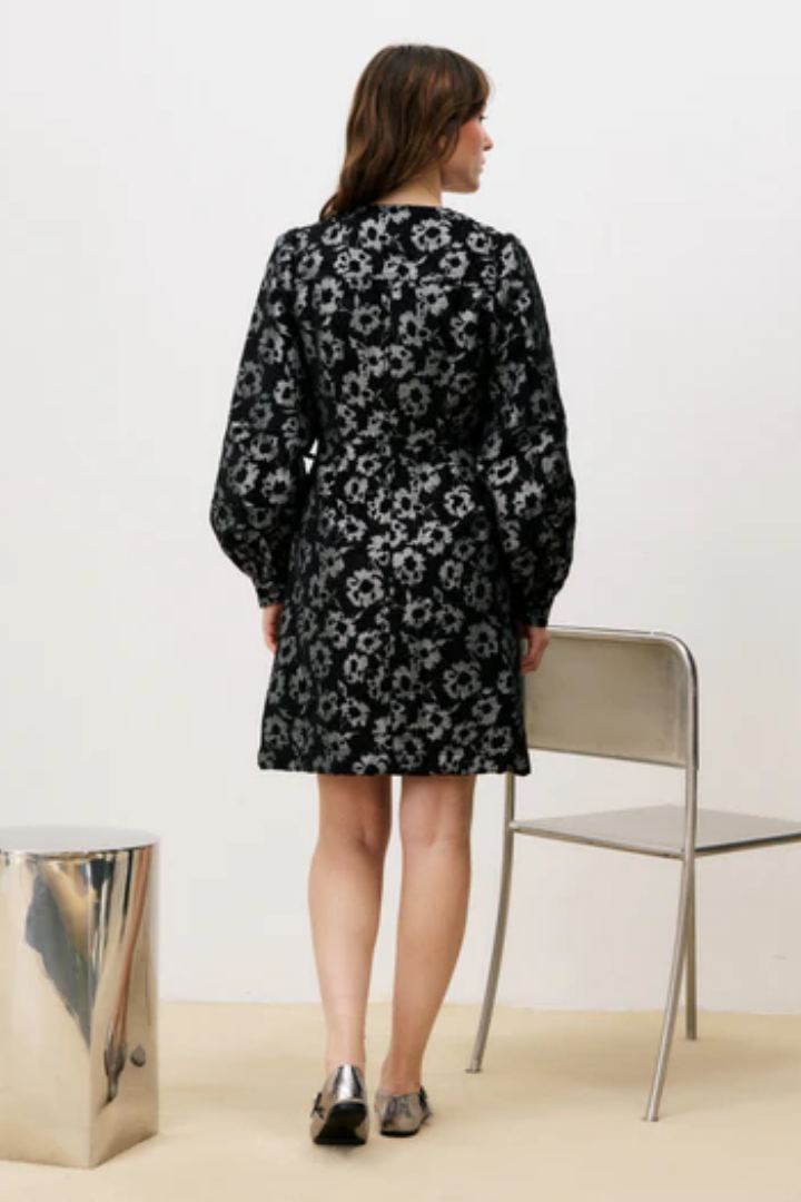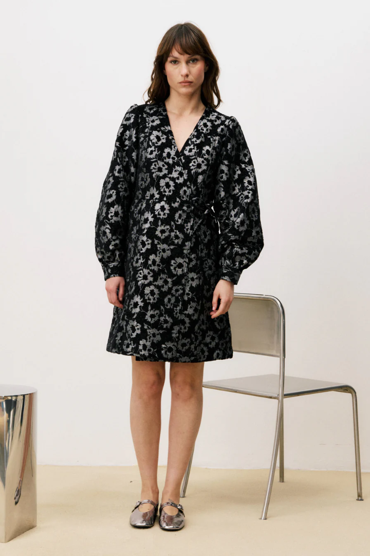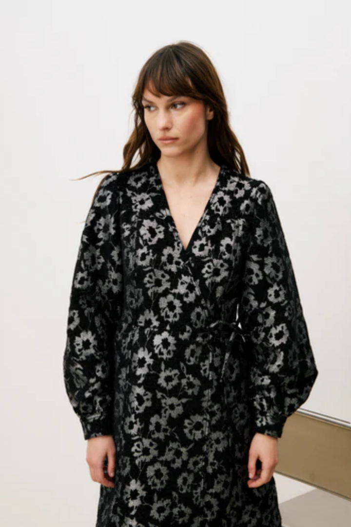 The Brooks Dress brings effortless elegance to your wardrobe with its striking black and silver lurex floral pattern that catches the light beautifully. The flattering wrap silhouette features a V-neckline and voluminous long sleeves that add movement and dimension, while the waist ties allow you to customize the sizing.