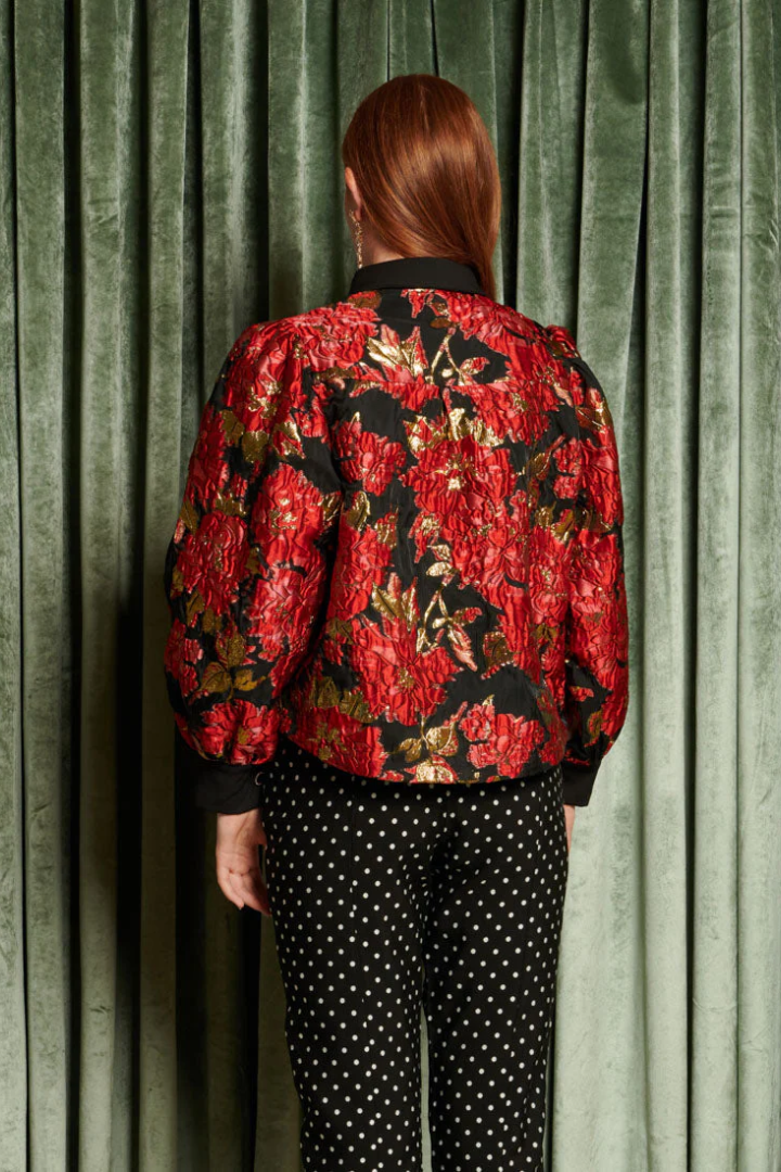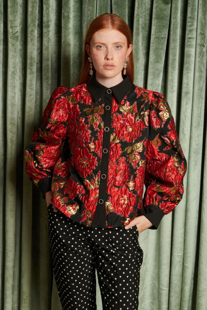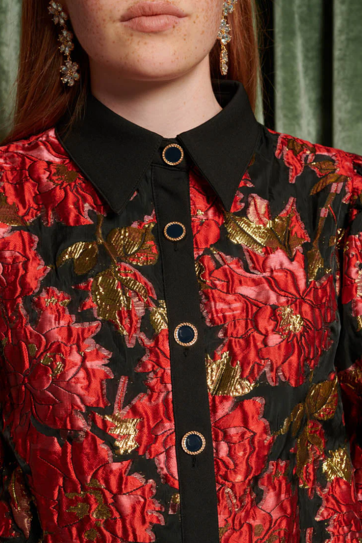 Indulge in the allure of the Illusions Jacquard Blouse. A mesmerizing metallic floral jacquard fabric creates an ethereal sheen, while the contrast collar and cuffs add a touch of refinement. The gold-edged buttons add a hint of old world glamour, making this loose-fit blouse a must-have for any occasion.