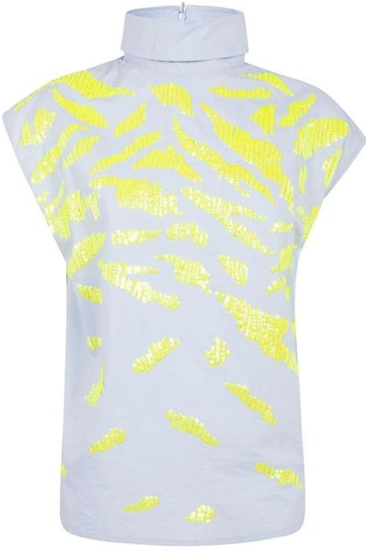 Add some sass and sparkle to your wardrobe with our Hate Sequin Highneck Top. Designed with a unique sleeveless silhouette and angular shoulders, this cotton-poplin shirt features intricate zebra stripes made from shimmering sequins. A slightly boxy cut adds to the overall edgy and playful vibe of this top.