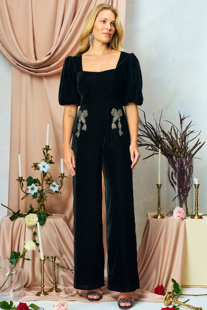 The Chelsea jumpsuit brings timeless elegance to modern occasion wear. Crafted in luxuriously soft black velvet, this figure-flattering design features charming embellished bows at each hip and a striking oversized bow detail at the back with a keyhole cutout. Feminine puff sleeves add a touch of sophistication, while practical pockets ensure comfort alongside style. Perfect for those seeking a chic alternative to traditional dresses, the Chelsea combines classic Hope & Ivy refinement with contemporary flair for any special event.