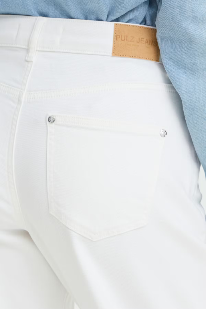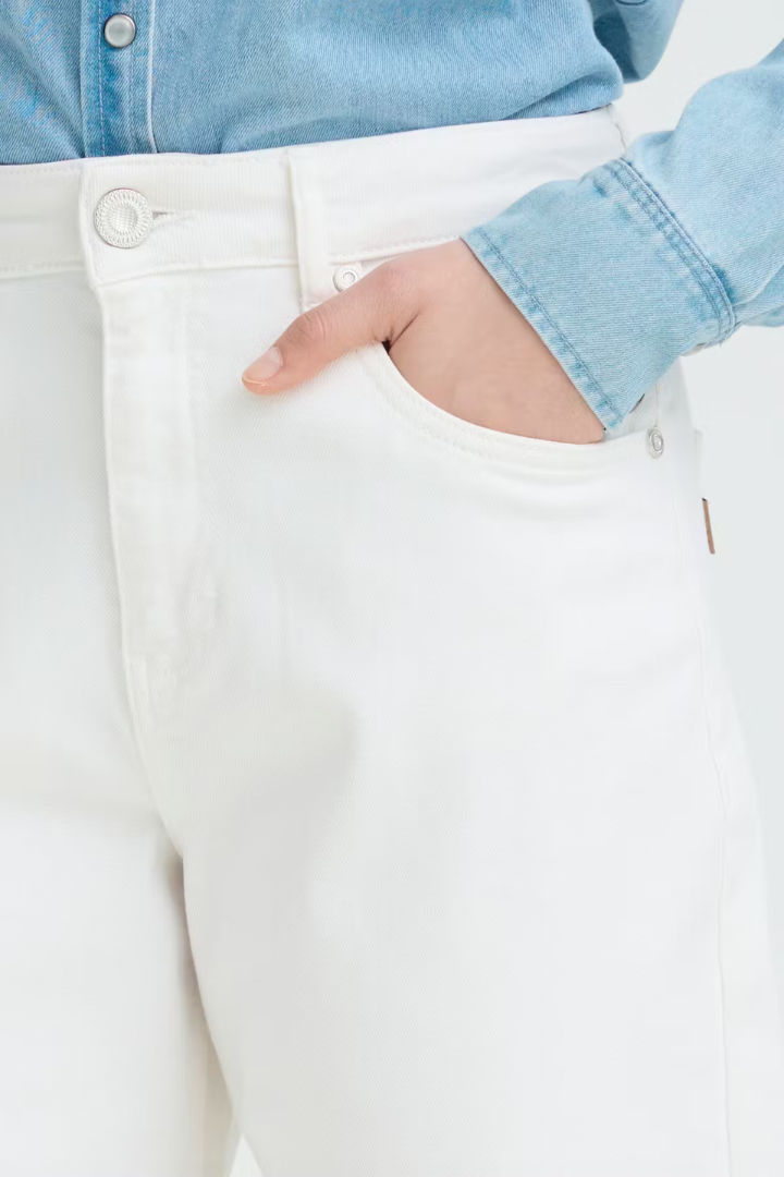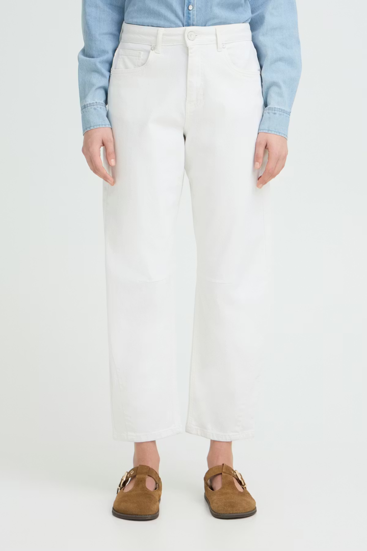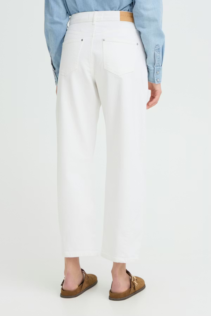 The Anni Barrel Jeans combine timeless style with contemporary design. Cut from crisp white denim, these high-rise jeans feature a sculpted curved leg that flatters your silhouette. Classic five-pocket styling meets subtle seam detailing that enhances the structured shape, creating a polished, modern look. Perfect for elevating your everyday wardrobe with effortless sophistication.
