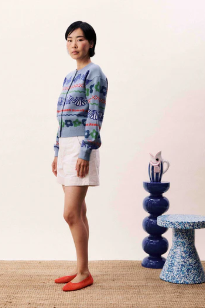 Discover the charm of the Federica Cardigan, a beautifully crafted jacquard knit that brings coastal-inspired elegance to your wardrobe. This women's round neck cardigan features intricate maritime and floral motifs—playful fish, delicate shells, and blooming flowers—woven throughout in shades of blue, green, red and grey against a soft light grey base. Mother-of-pearl buttons add a touch of sophistication, while ribbed trim at the cuffs, collar and hem ensures a polished, comfortable fit. Perfect for layering over your favourite pieces, this timeless design celebrates artisanal craftsmanship and effortless style.