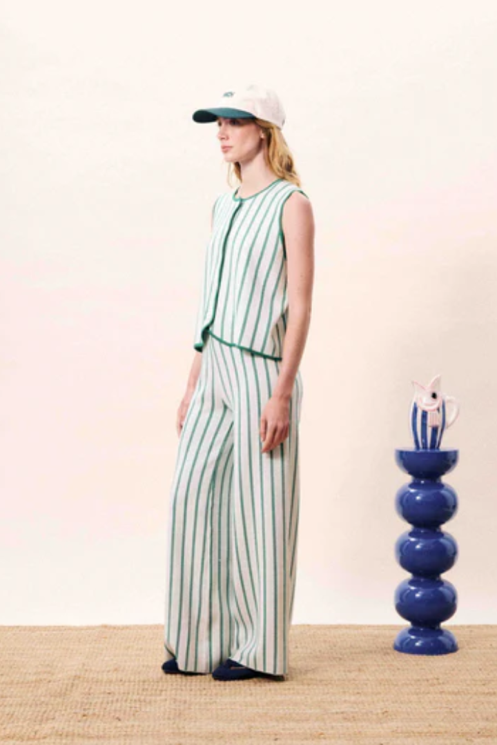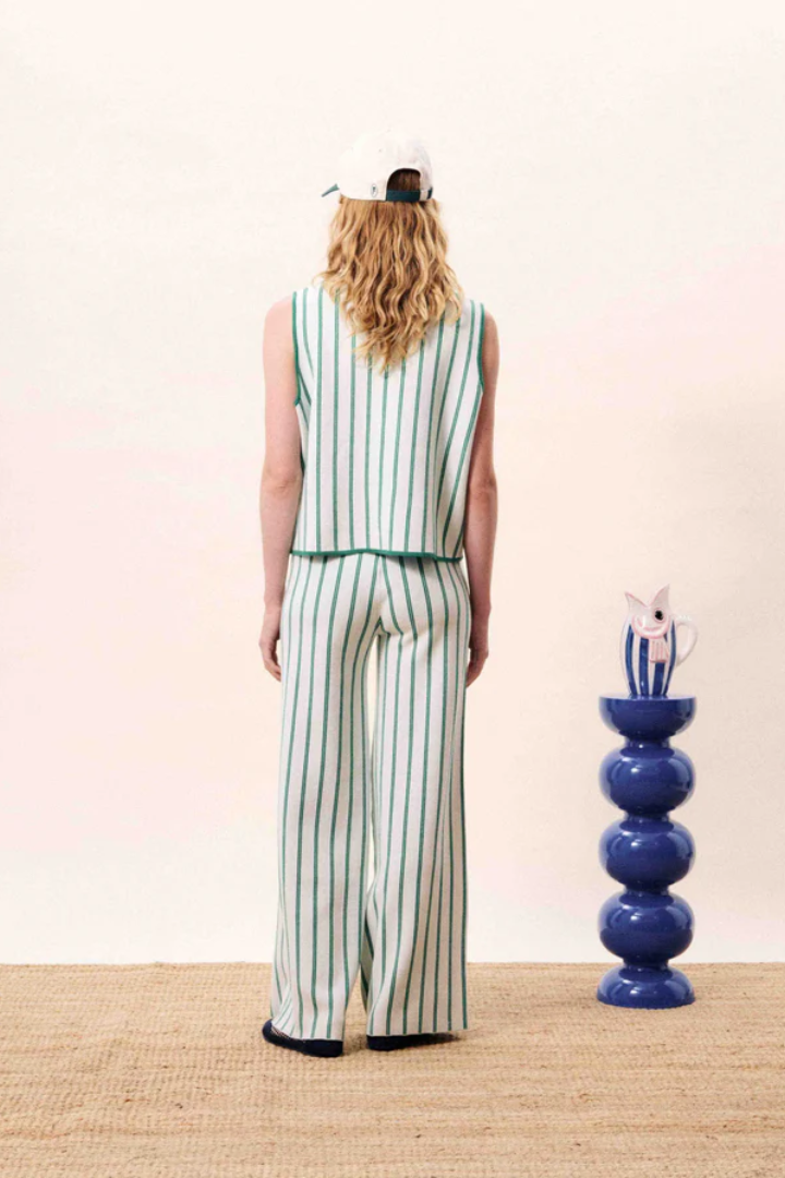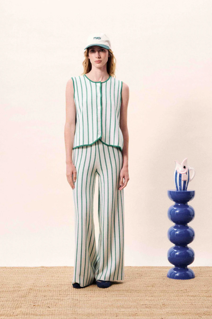 Embrace effortless style with these striking Loquinhas Pants. Featuring a flattering wide-leg silhouette with vertical green stripes against a crisp white base, they offer a modern twist on a classic look. The high-waisted design with a smocked elastic waistband ensures comfortable all-day wear, while the ankle-length straight leg creates a polished, put-together finish. Perfect for elevating your everyday wardrobe with understated elegance and movement.