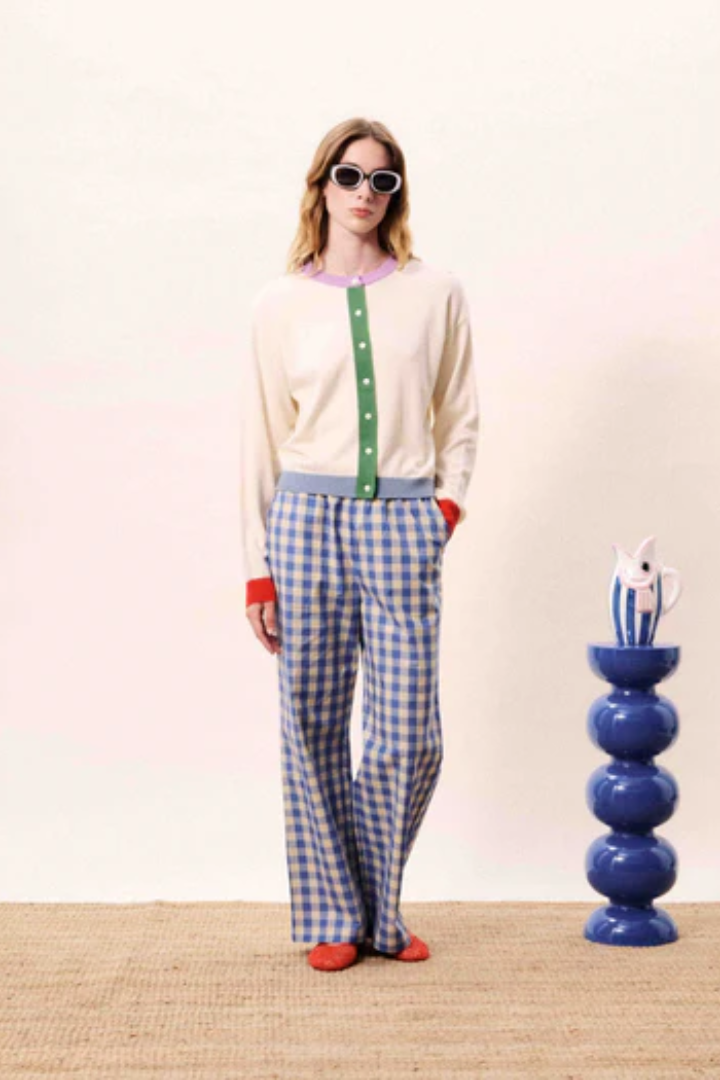 The Patrick Cardigan brings playful colour to your everyday wardrobe. This knit cardigan features a natural beige mesh base with striking colourblock accents—a purple collar, red cuffs, and blue-grey hem create visual interest. The long sleeves and round neckline offer classic comfort, while the contrasting green band frames the front button fastening for a polished finish. With its straight, fitted silhouette, this piece layers beautifully over basics or stands alone as a statement layer.