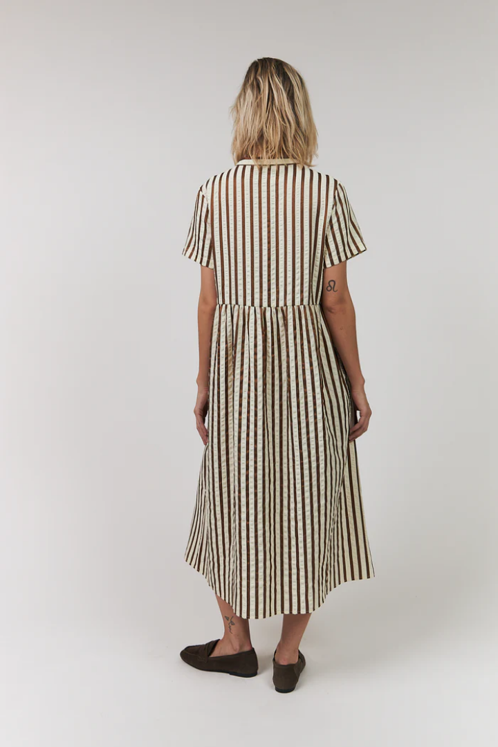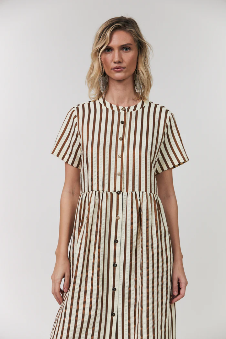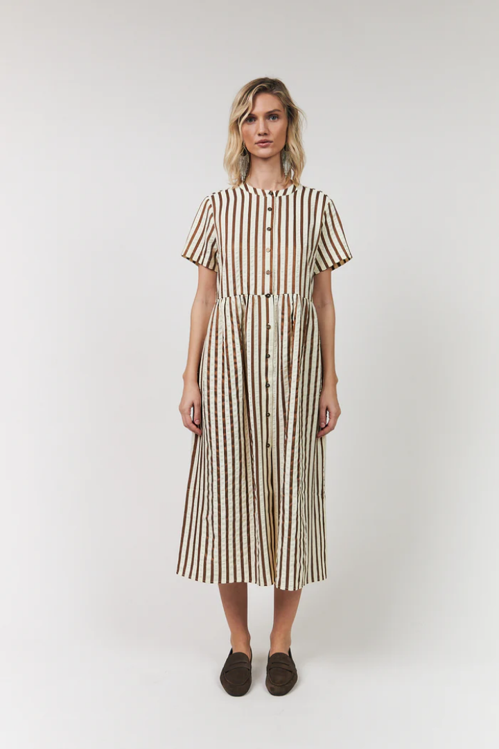 The Aliya Short Sleeve Maxi Dress brings effortless elegance to your everyday wardrobe. Crafted in a soft, breathable fabric, this dress features striking vertical stripes that elongate your silhouette beautifully. The thoughtfully designed high waist gathers gently to create a flattering drape, while the front button closure adds practical charm. Short sleeves keep you comfortable throughout the day, whether you're heading to work or enjoying leisure time. The clean, timeless silhouette makes this dress a versatile piece you'll reach for again and again.