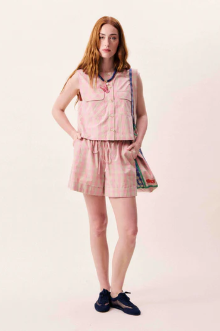 The Aurora Gilet is a timeless sleeveless jacket featuring a charming pink and beige gingham check pattern. Designed with a straight, fitted silhouette, it offers a polished look that pairs effortlessly with any wardrobe. The front fastens with elegant gold buttons, while two practical patch pockets on the chest add both style and function. Perfect for layering over dresses, shirts, or knitwear, this versatile piece transitions seamlessly from season to season.