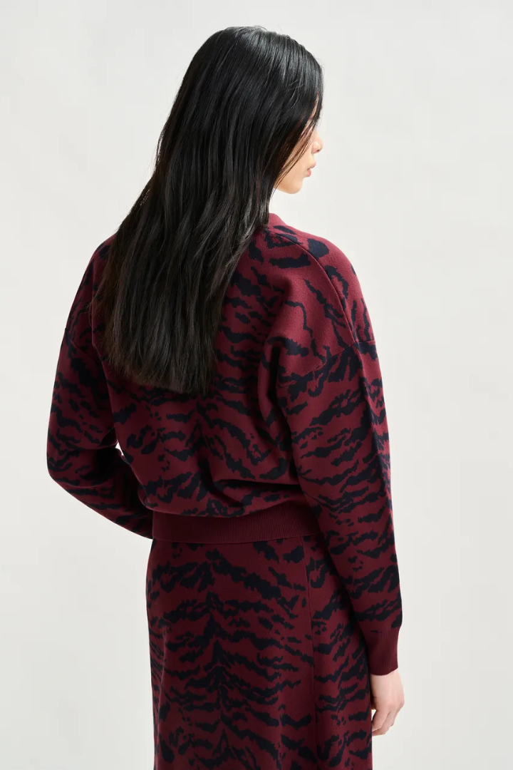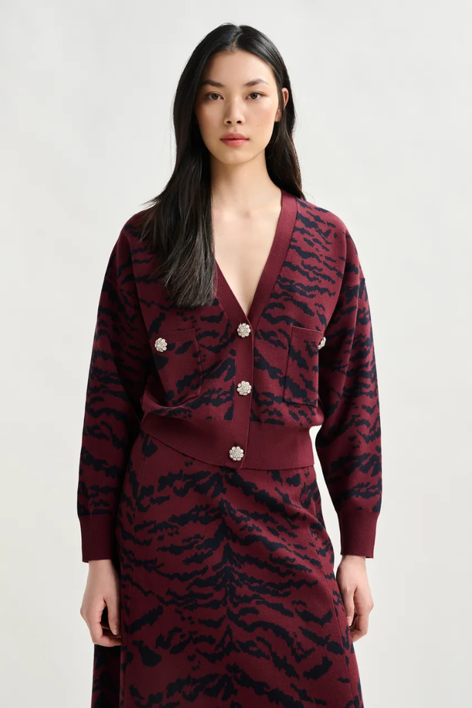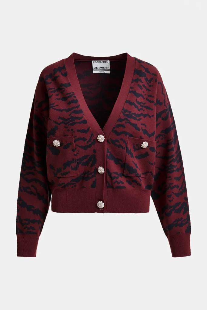 The Cali Zebra Cardigan offers a relaxed, flattering fit that tapers gently at the hips for comfort and style. Crafted from fine knit fabric, it features a button fastening with eye-catching rhinestone-embellished buttons and practical chest pockets. Ribbed trims add structure while maintaining softness, and the bold tiger print in rich burgundy and navy brings a unique touch to your wardrobe. Perfect for layering, this cardigan combines comfort with standout details effortlessly.