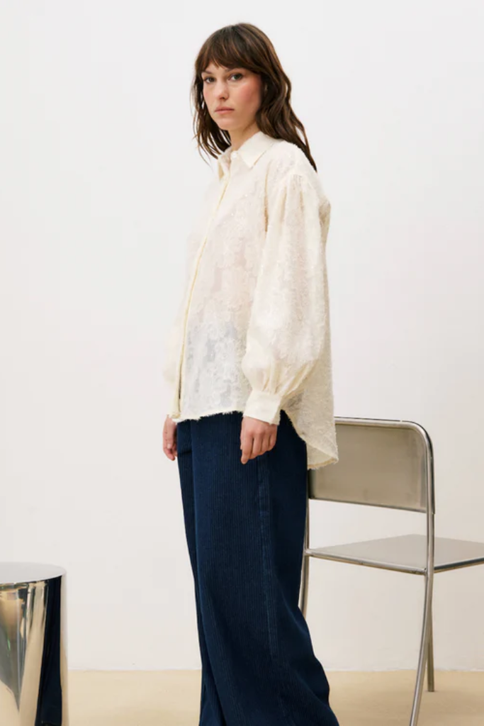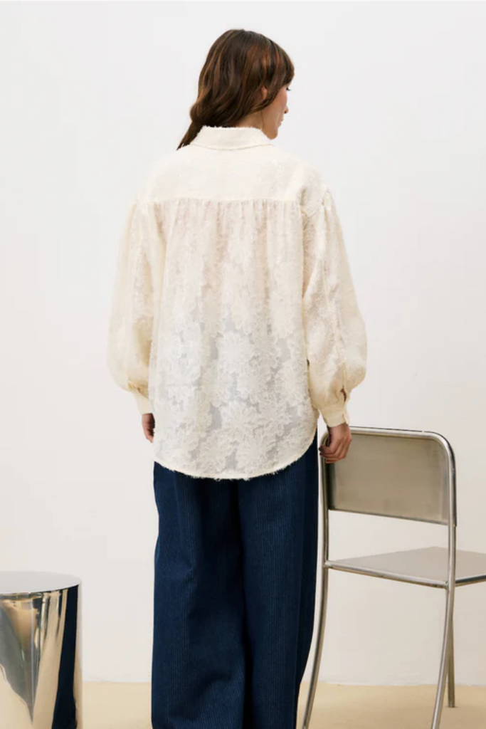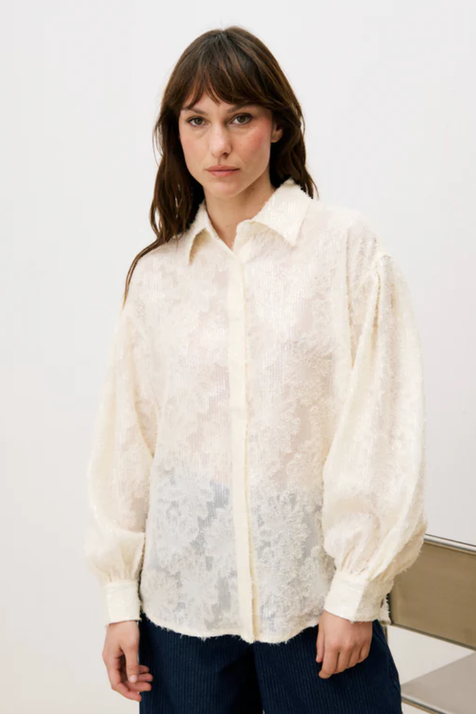 The Candi blouse from FRNCH is a standout piece that effortlessly elevates any wardrobe. Crafted from lightweight, semi-sheer fabric, this cream-colored blouse features a delicate floral pattern adorned with all-over sequins that catch the light beautifully. The straight silhouette and classic collar provide timeless appeal, while the button closure ensures easy styling. Long sleeves finished with voluminous cuffs deliver a feminine, sophisticated edge. Whether you're dressing up for special occasions or adding sparkle to your everyday look, this versatile blouse pairs beautifully with trousers or jeans for an effortlessly chic ensemble.