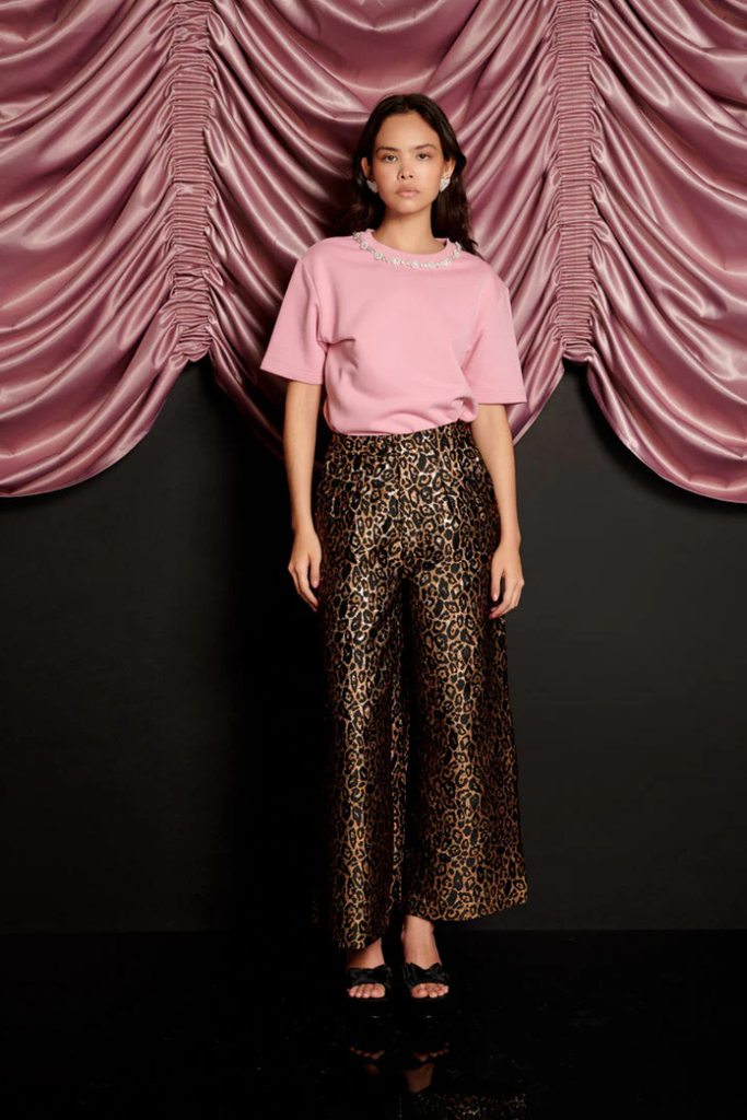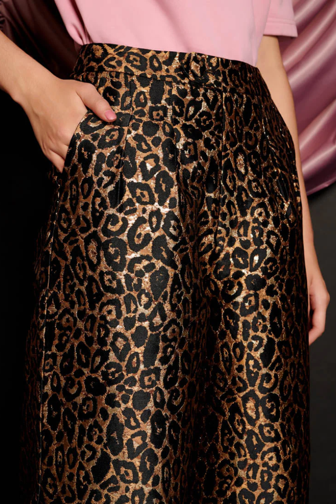 These high-waisted Cherie Leopard Jacquard Trousers combine style and comfort with their luxurious jacquard fabric featuring a subtle leopard pattern. Fully lined for a smooth fit, they include a secure waist button fastening and practical side seam pockets. Designed to flatter your silhouette, these trousers offer both elegance and everyday ease.