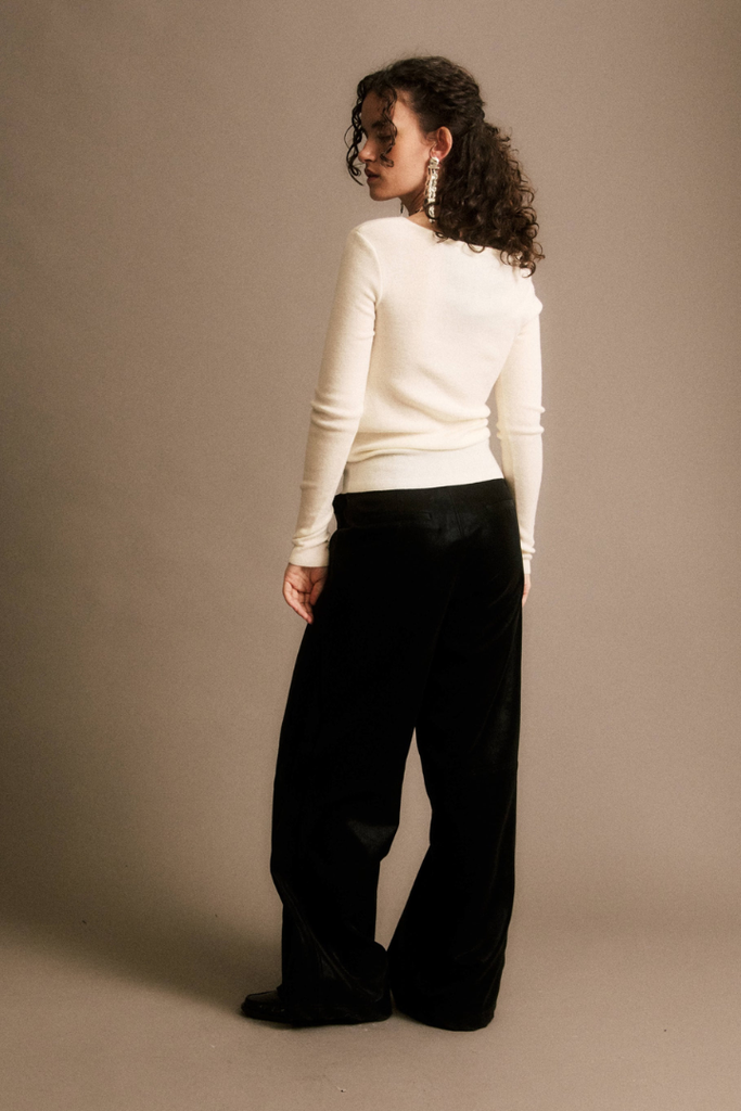 These Dorine Pants combine comfort and style with a high waist design that flatters your silhouette. Crafted for ease, they feature a button and zip closure plus practical Italian pockets. The wide black fabric offers a relaxed fit, making them perfect for both casual outings and more polished looks.