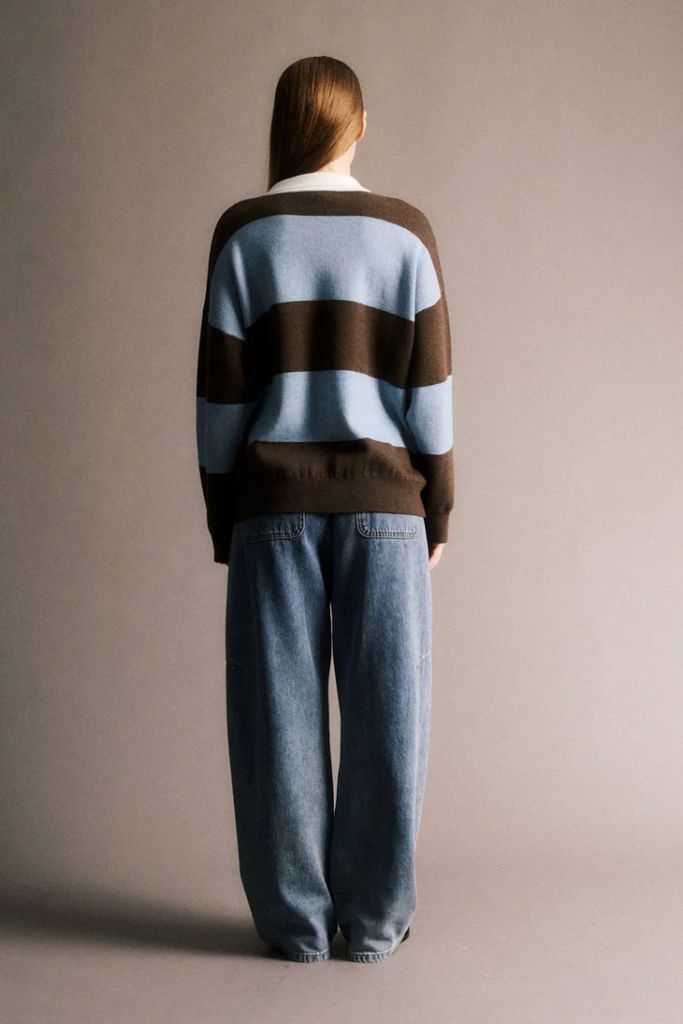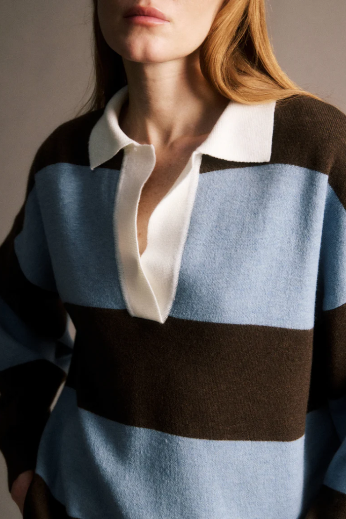Embrace cozy style with the Enorah Knit Jumper, featuring a soft wool blend in a refreshing sky blue and chocolate stripe design. Its oversized polo collar adds a relaxed, fashionable touch, while the straight cut ensures comfortable wear throughout your day. Ideal for layering or wearing on its own, this jumper combines warmth with effortless style.