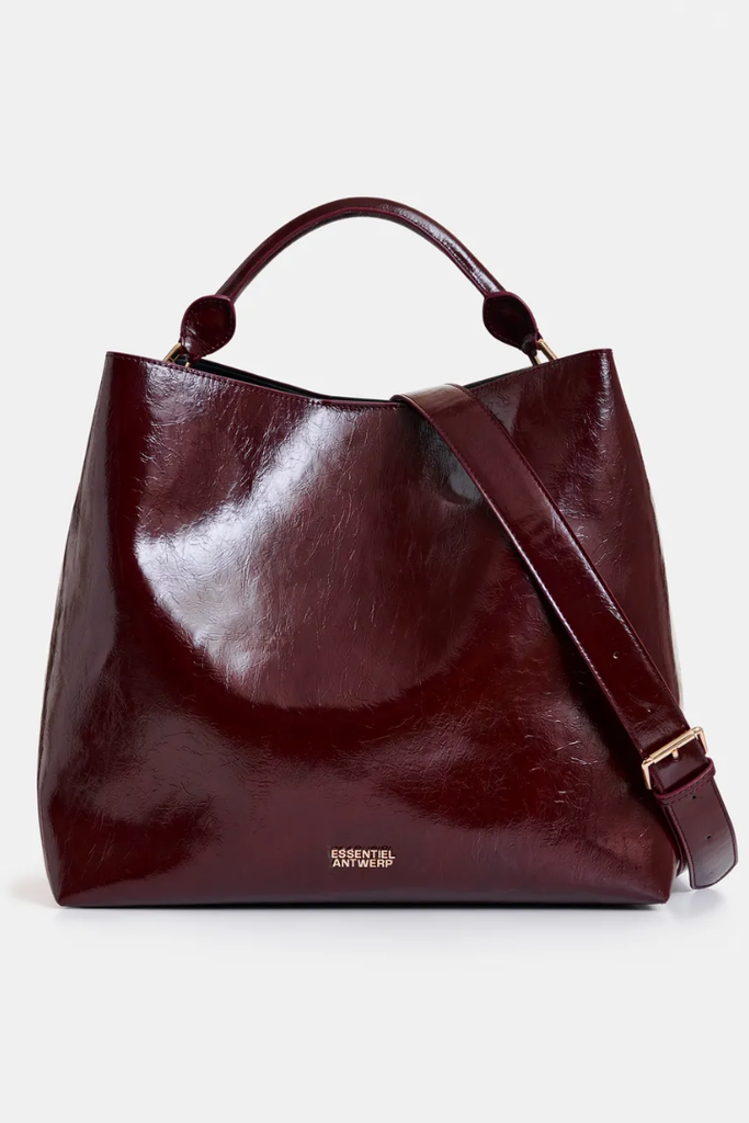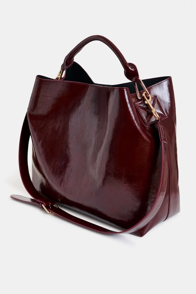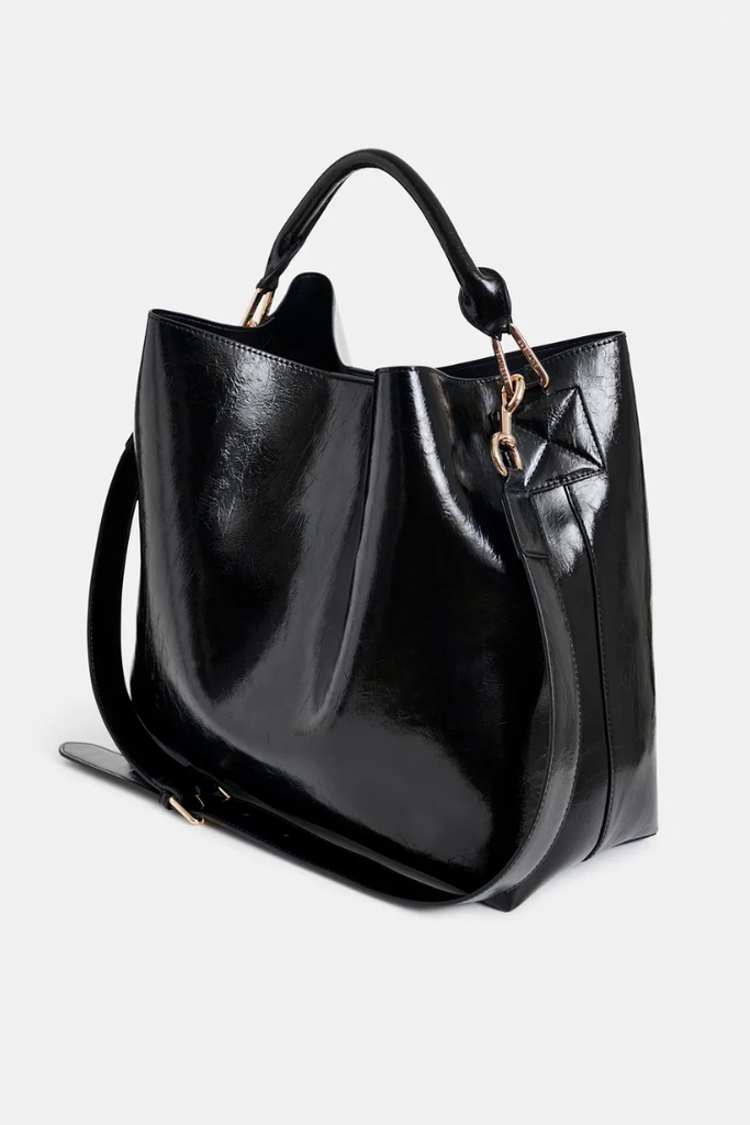 Crafted from glossy faux leather, the IHurley Shiny Shopper Bag combines style and practicality with its slouchy rectangular shape. Its rolled top handle offers a comfortable handheld option, while the detachable shoulder strap allows for hands-free convenience. Inside, the lined interior features a zipped pocket and card slot to keep your essentials organized and secure. Complete with gold hardware and a matching zipped pouch, this bag is designed to support your everyday needs with effortless elegance.