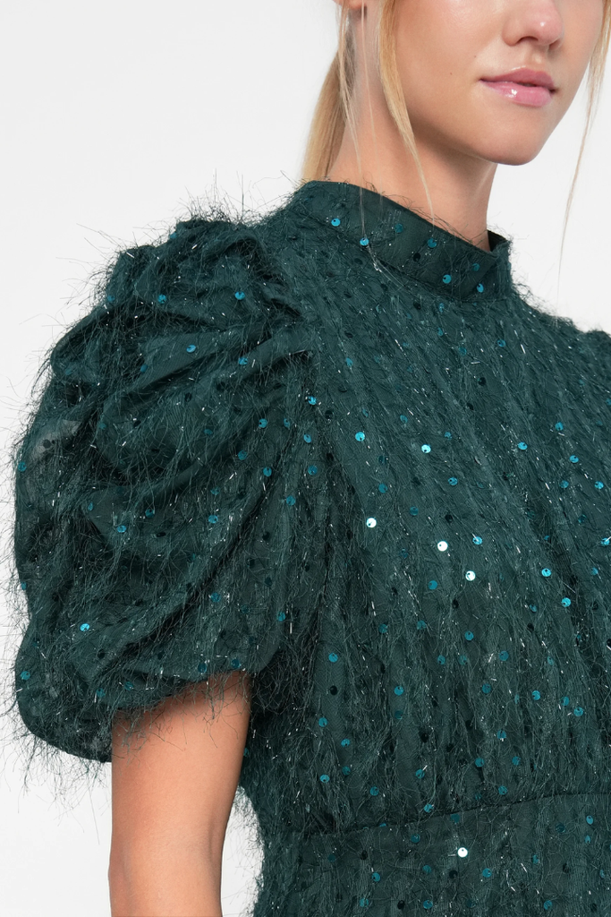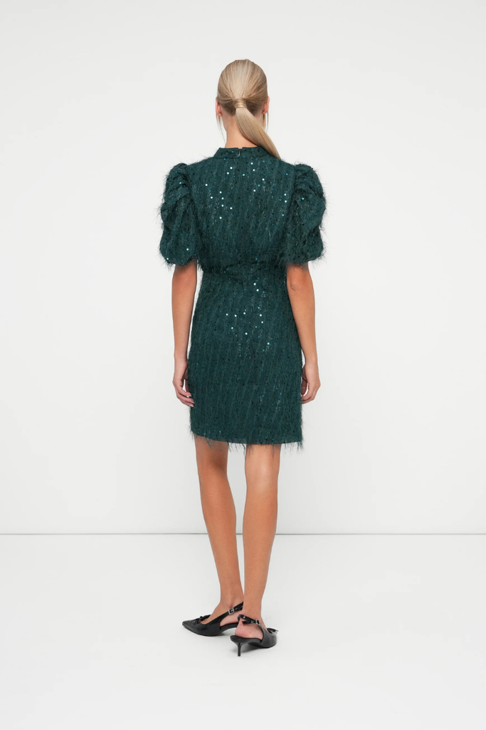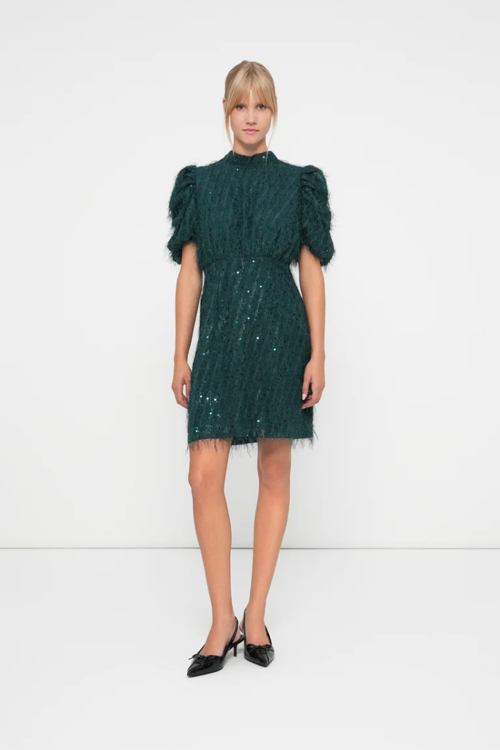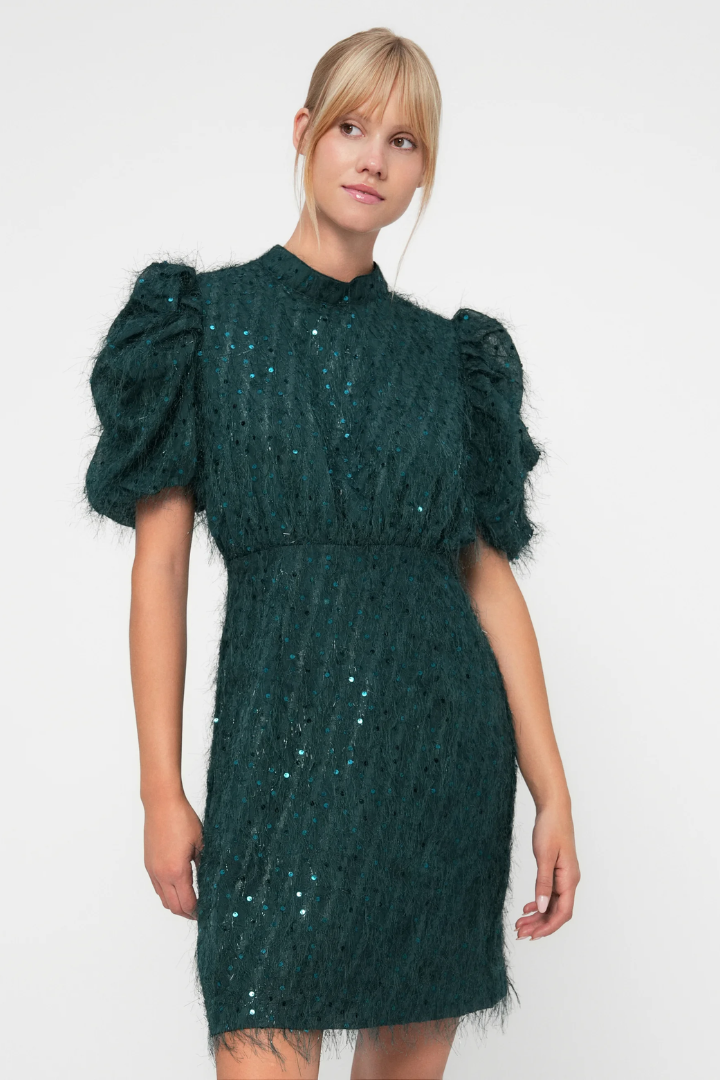 Introducing the Ilza 2/4 Sequin Dress from Y.A.S – your go-to piece for making a memorable entrance. This stunning green mini dress features eye-catching sequins paired with a playful fringed hair design that captures attention from every angle. The elegant puff sleeves and high neckline create a sophisticated frame, while the flattering A-line silhouette works beautifully with any body shape. The mini length brings a youthful, fun energy to your look, and a discreet back zip ensures a polished, seamless fit. Whether you're heading to a party or celebrating a special occasion, this dress gives you the confidence to shine with effortless glamour.