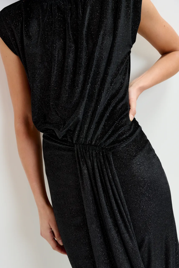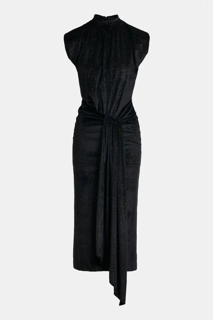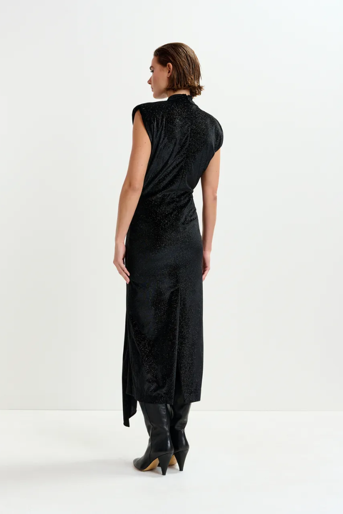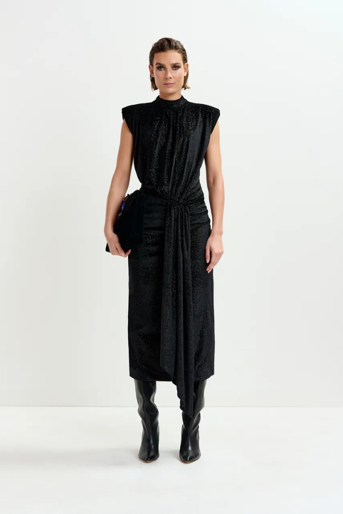 This midi dress offers a comfortable stretch-jersey fabric adorned with subtle black-tone dots that create a delicate glitter effect. Designed to flatter, it features a figure-hugging waist and a wrap-inspired skirt with box pleat detailing and a generous front split, allowing ease of movement. Lightly padded shoulders and a tailored mock neck add structure and elegance, making it a versatile choice for both day and evening occasions.