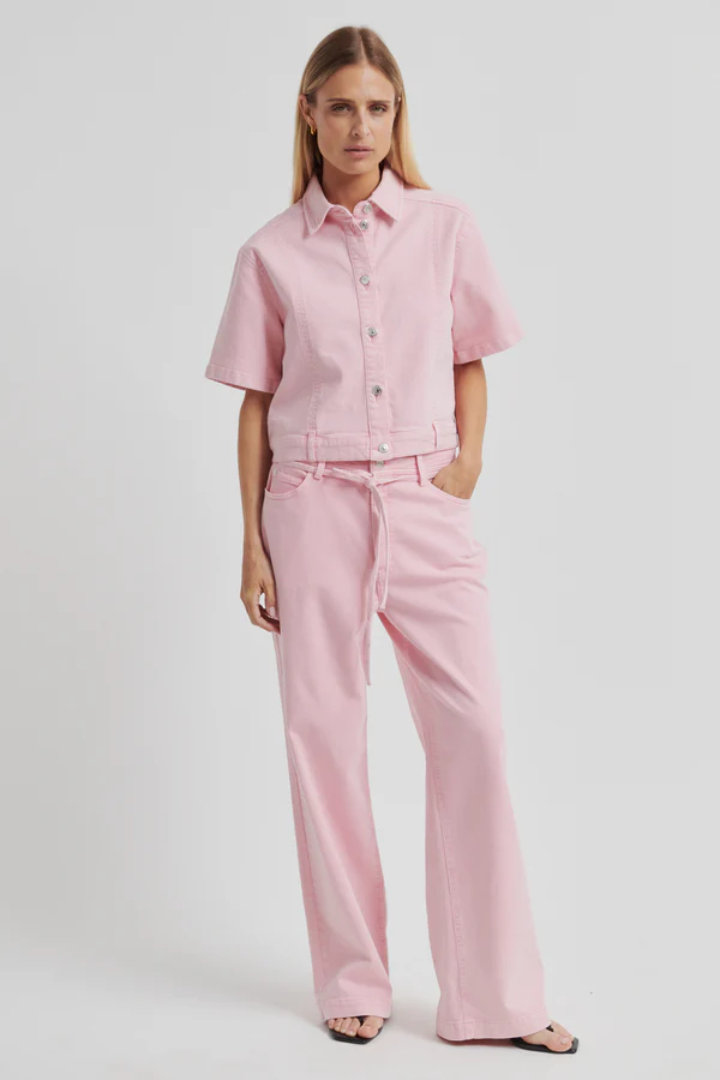 Isella Denim Jeans in soft pink cotton denim deliver effortless style with tonal stitching detail. Featuring a mid-high waist and extra-wide straight legs for a relaxed, contemporary silhouette. Secured with concealed zip fastening, button waist closure, and adjustable tie belt. Classic 5-pocket construction ensures practical everyday wear. Perfect for creating laid-back looks with versatile appeal.