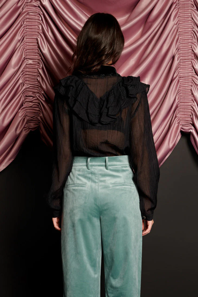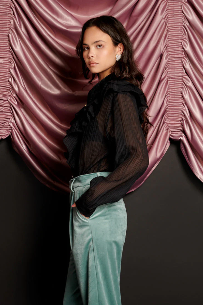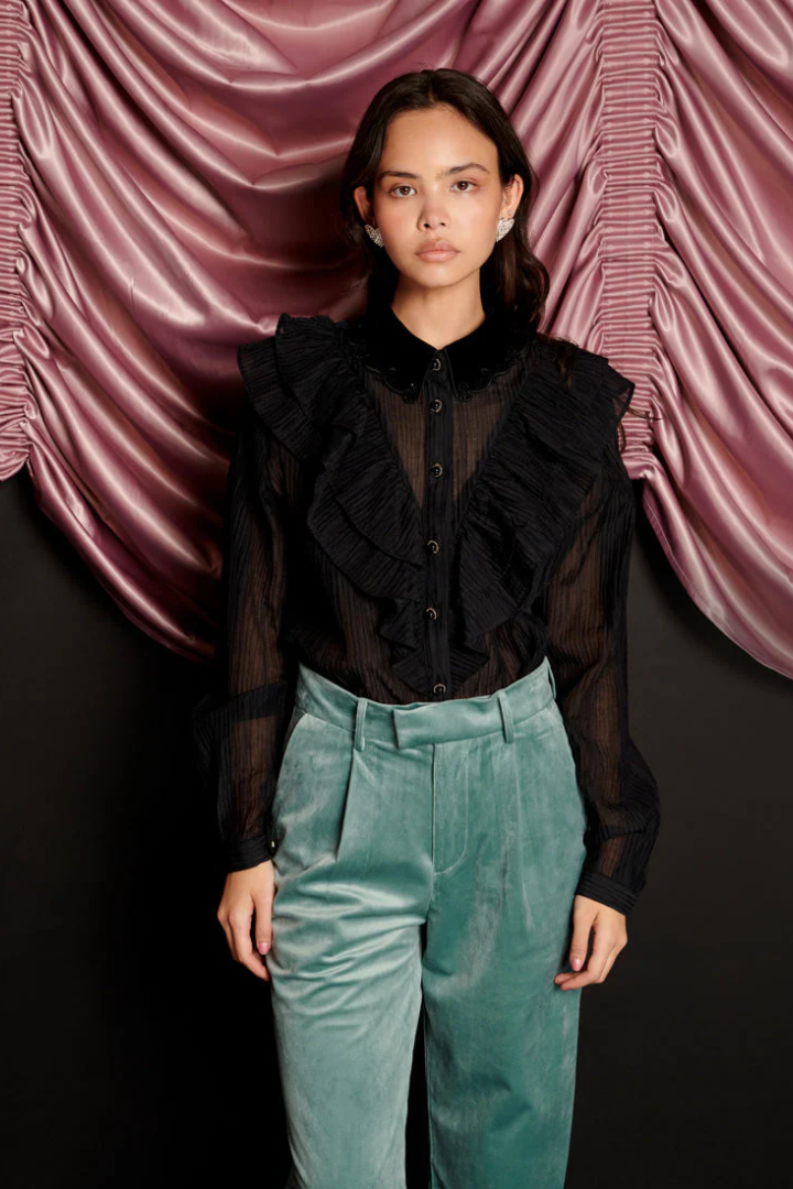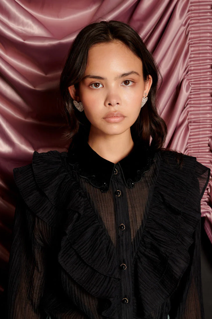 The Kelly Ruffle Blouse combines delicate chiffon ruffles with a sparkling velvet collar, creating a perfect balance of whimsy and elegance. Its light, airy fabric moves gracefully, while the embellished collar adds a touch of refined glamour. Ideal for those who want to express their unique style with confidence and charm.