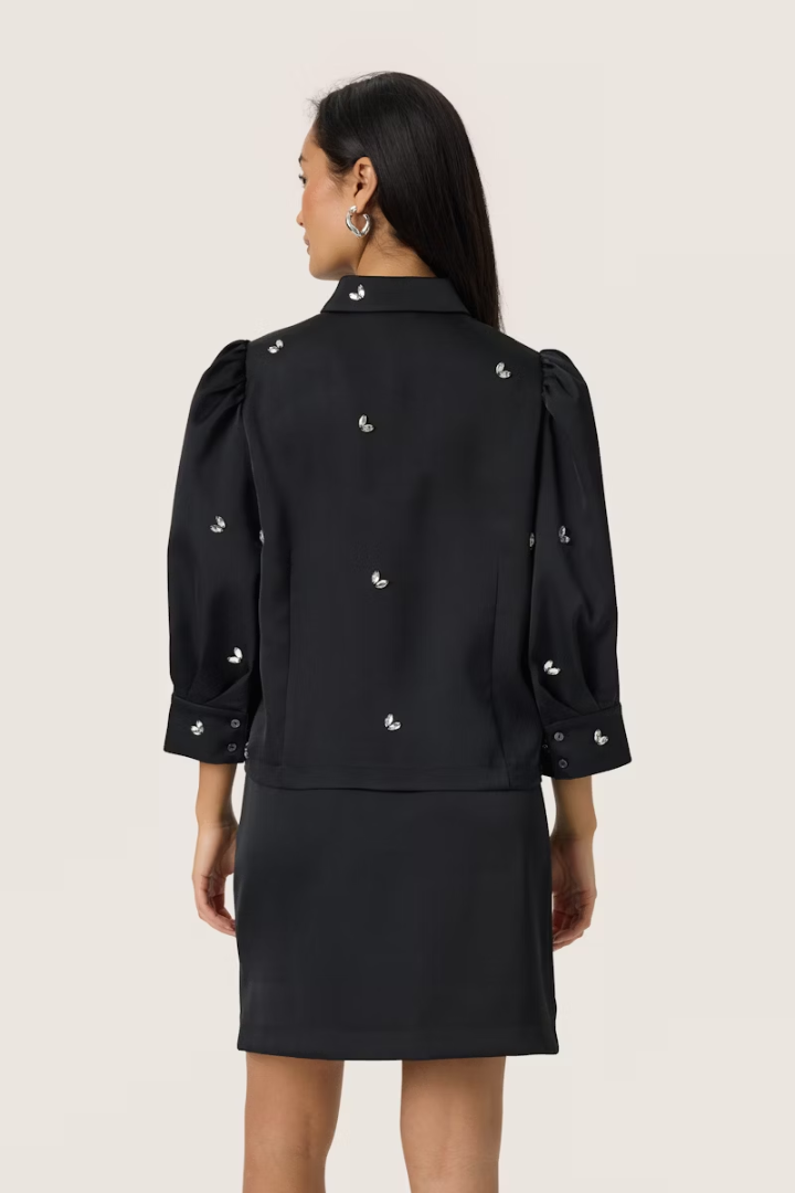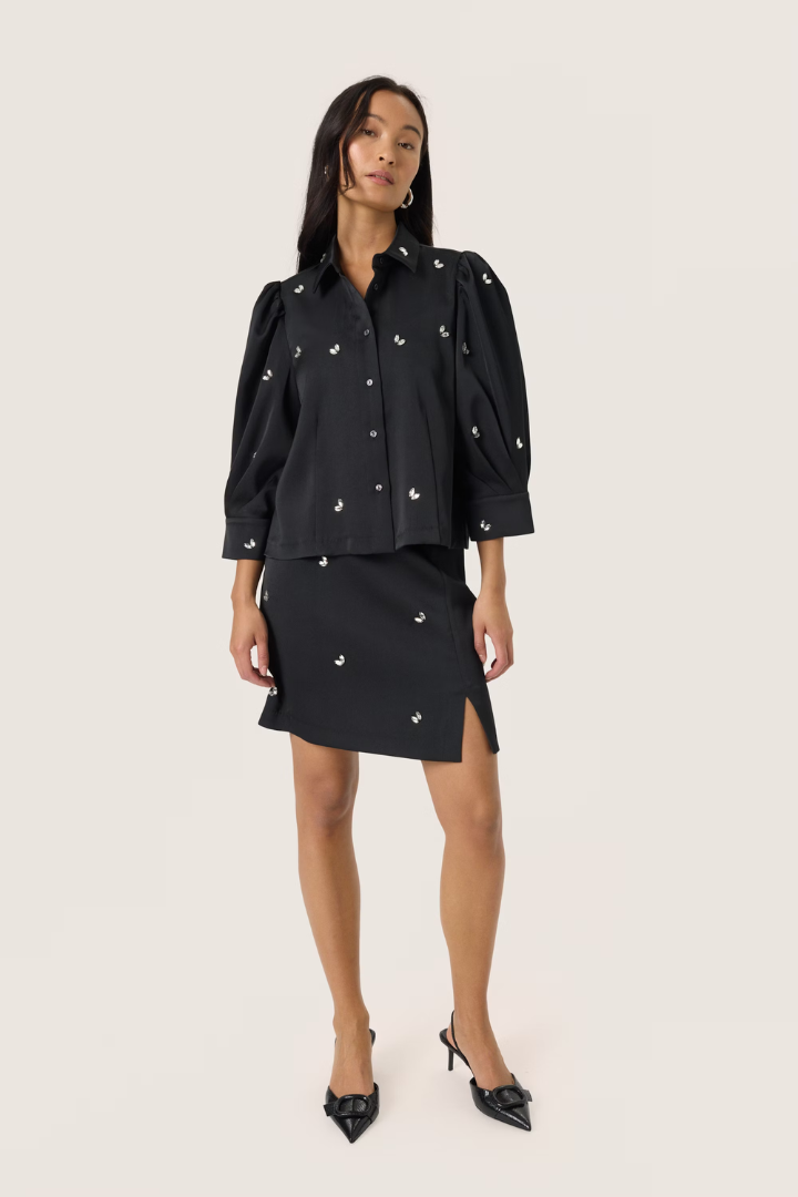 Elevate your wardrobe with the Selda Chiba Shirt, a stunning black piece that combines understated elegance with eye-catching detail. Adorned with decorative stones that catch the light beautifully, this shirt features voluminous sleeves that add movement and dimension to your silhouette. The relaxed fit ensures comfort without compromising on style, while the feminine design flatters effortlessly. Wear it as a standalone statement piece or pair it with the matching skirt to create a cohesive, polished ensemble. The model pictured wears a size M.