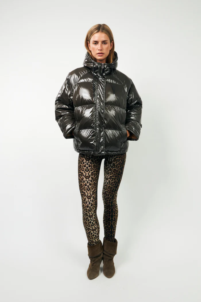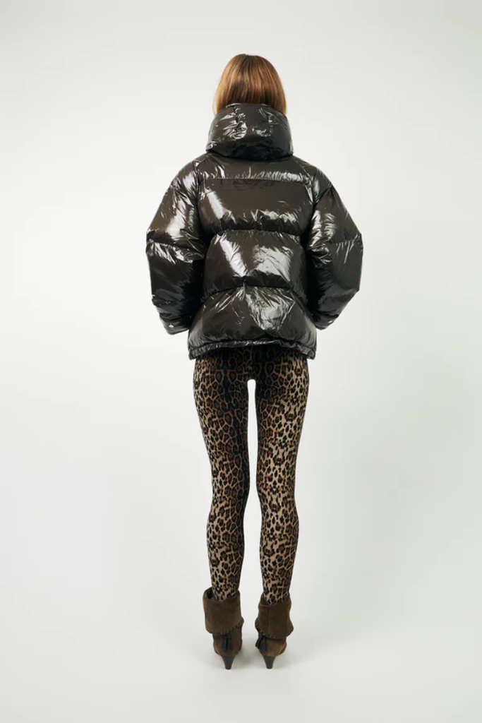 The Shelby jacket returns, combining comfort and style for chilly days. Its oversized fit and high collar with a large adjustable hood offer excellent warmth and protection. Crafted from glossy brown fabric, this puffer jacket features inner ribbed cuffs to shield against wind and an adjustable hem for a personalized fit. Quilted side pockets keep your essentials safe, while the zipper and snap buttons provide secure closure. Perfect for adding a modern, sporty touch to your winter wardrobe.