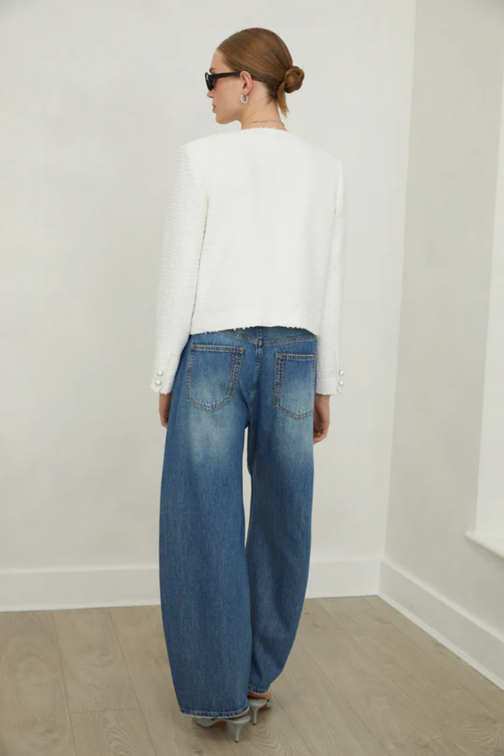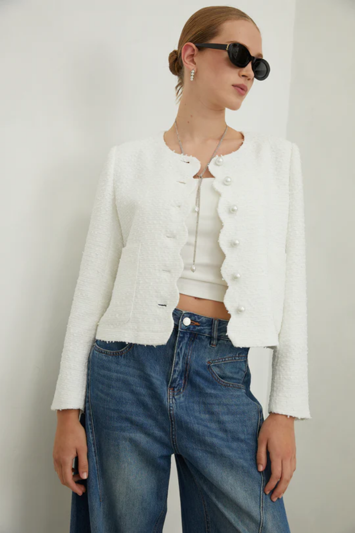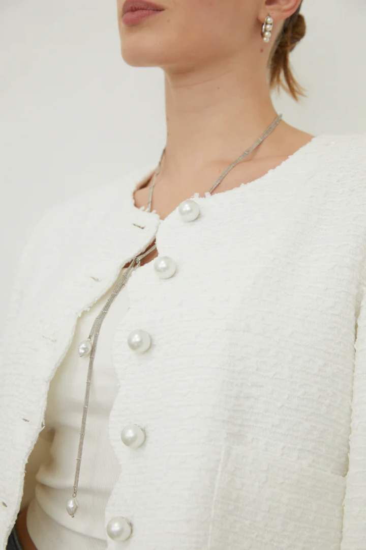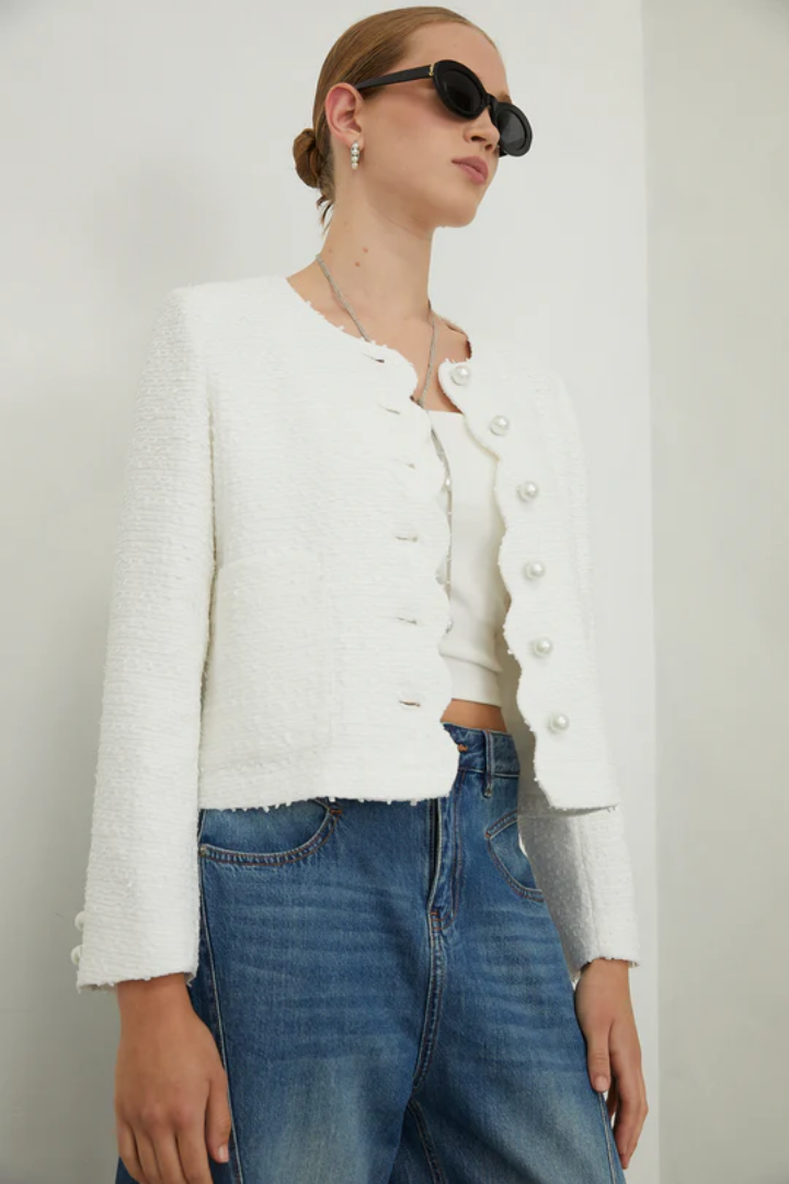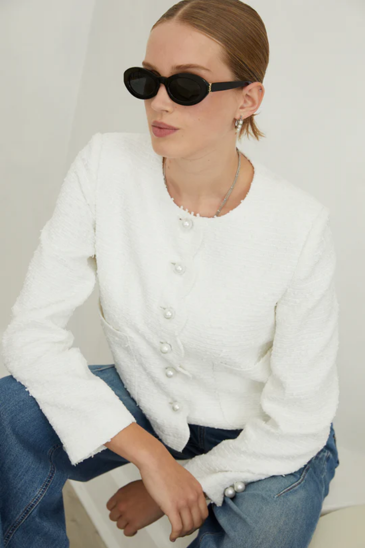 The Tessara Jacket embodies refined elegance with its luxurious tweed construction and lustrous pearl buttons that add understated sophistication. Thoughtfully designed with practical front pockets, this piece seamlessly blends classic tailoring with modern wearability. A versatile wardrobe essential that effortlessly transitions from day to evening, offering both timeless style and everyday functionality.