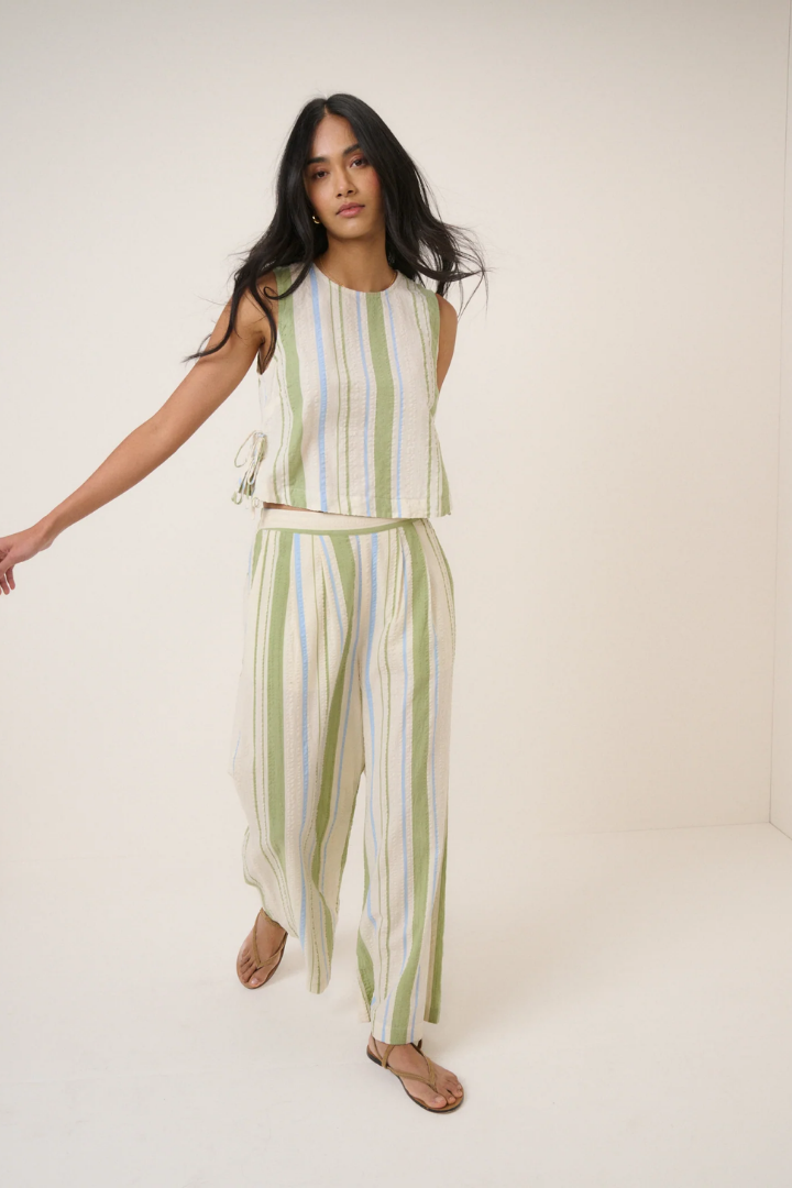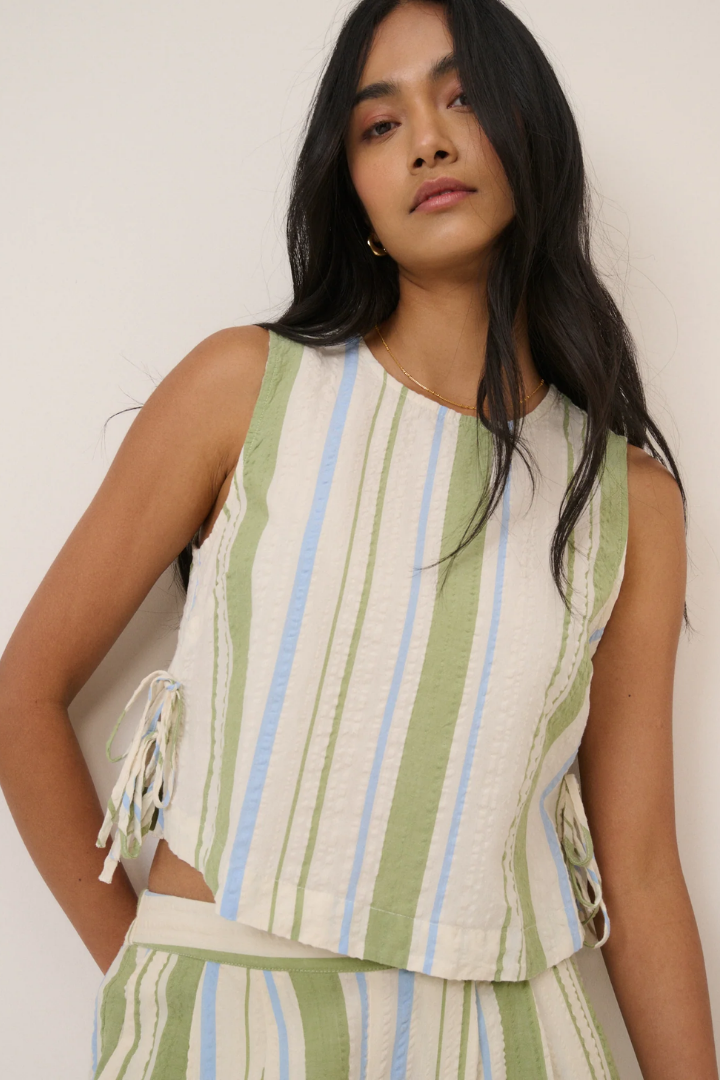 The Verity Top is a relaxed-fit sleeveless piece featuring a charming hand-drawn print created in-house. Cut to a cropped length with a classic round neckline, it's finished with practical side slits for ease of movement. A delicate tie detail at the front adds visual interest, while the keyhole back with button fastening creates an elegant focal point. Perfect for layering or wearing solo, this versatile top brings effortless style to any wardrobe.
